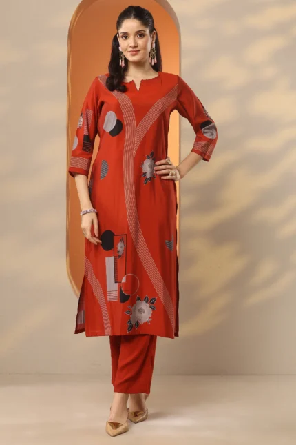 Rust Printed Silk Blend Straight Kurta