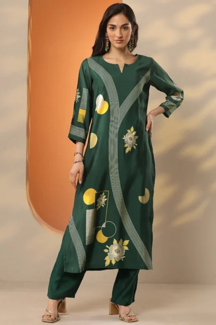 Green Printed Silk Blend Straight Kurta
