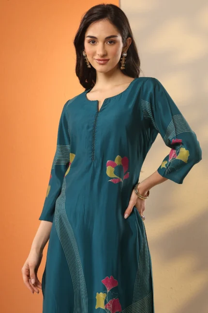 Blue Embroidered Chanderi Silk Straight Kurta