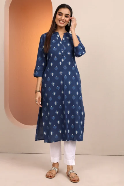 Blue Printed Cotton Straight Kurta