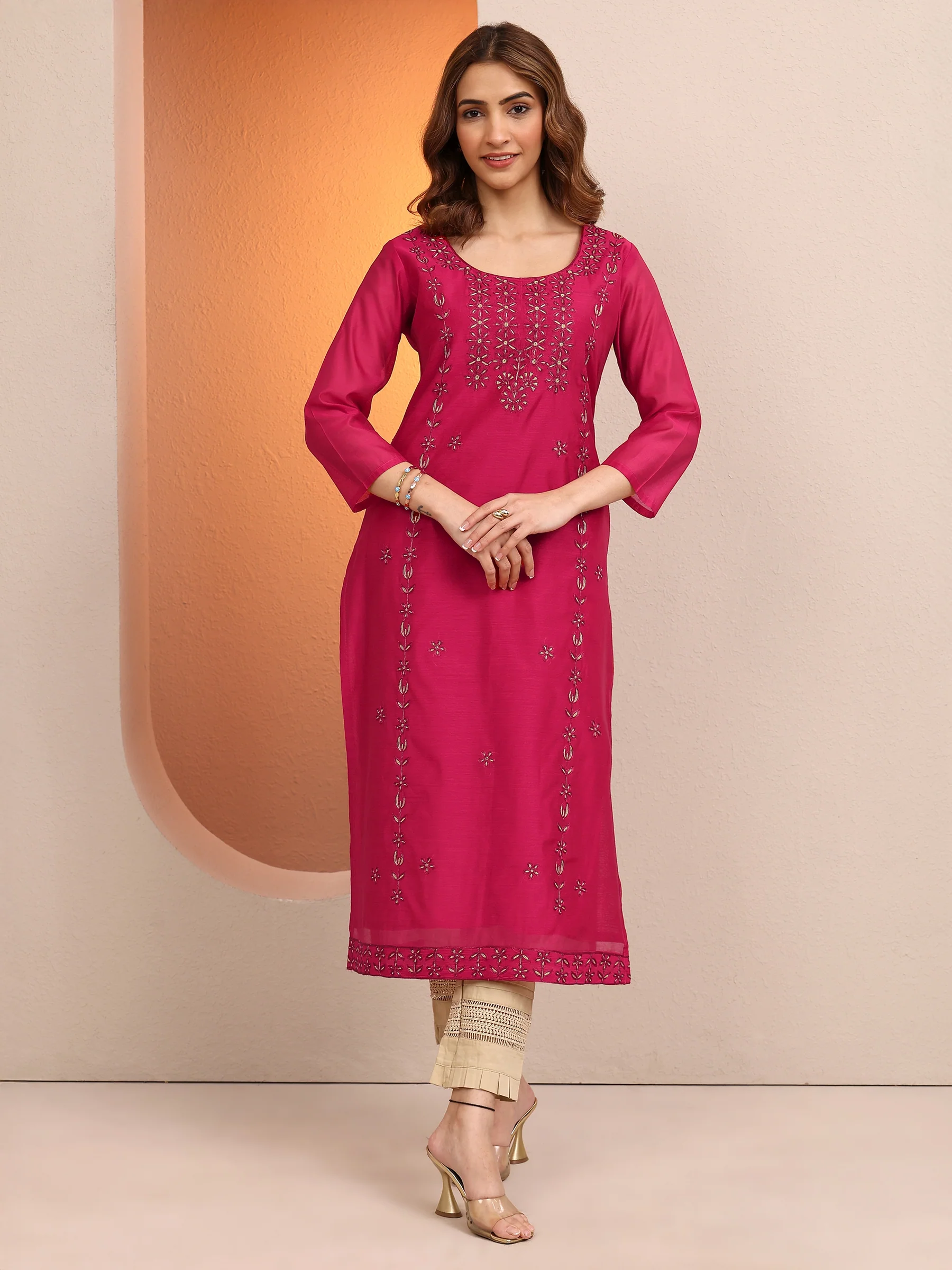 Pink Embroidered Chanderi Silk Straight Kurta