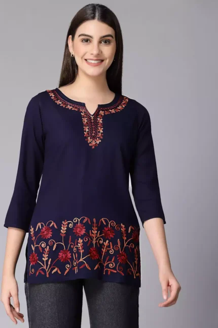 Blue Kashmiri Silk Work Short Kurti