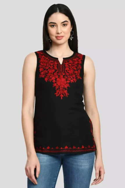 Black Kashmiri Sleeveless Short Kurti