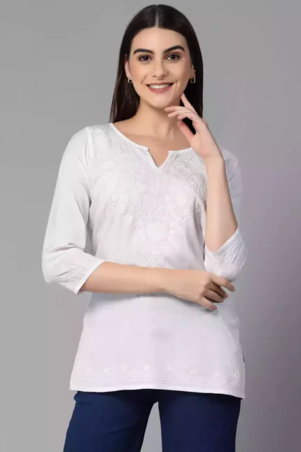 White Kashmiri Embroidered Short Kurti