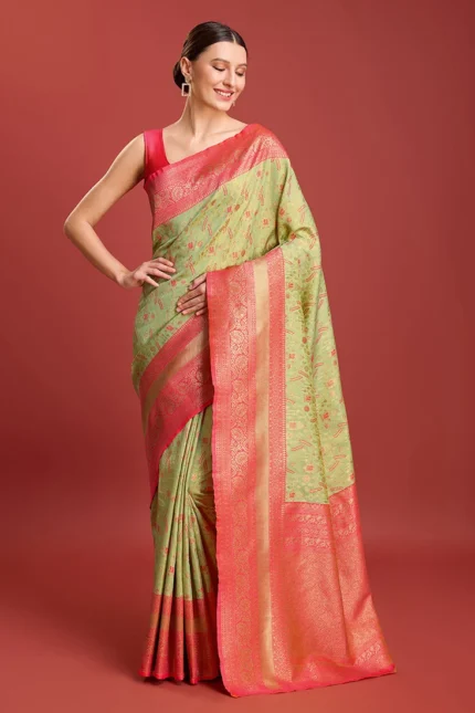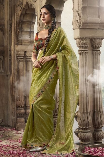 Pista Green Tissue Jacquard Zari Saree Festive Wear