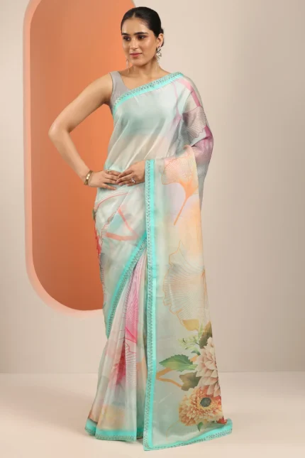 Multi Printed Organza Saree With Unstitched Blouse Piece