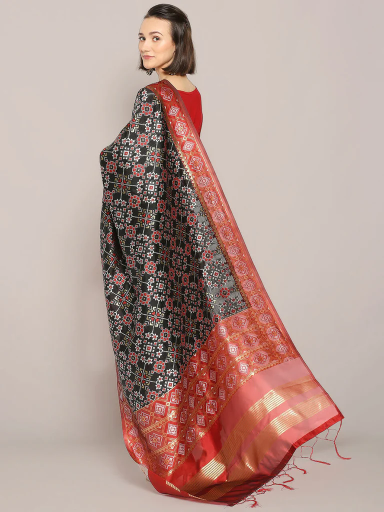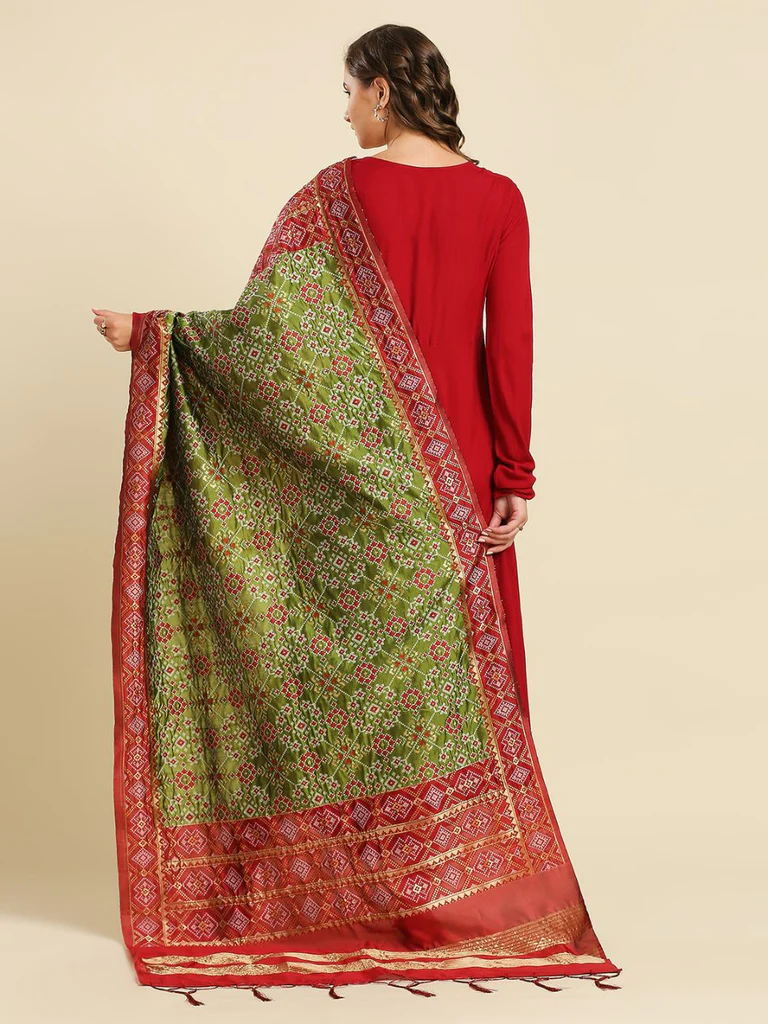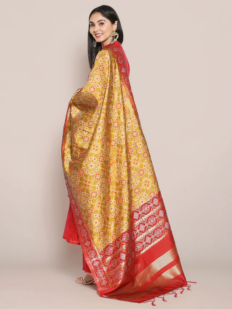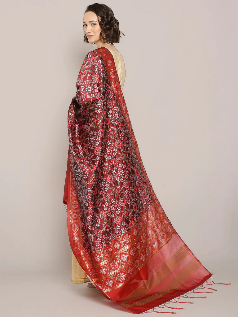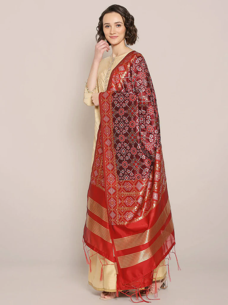 Add a touch of elegance to your wardrobe with this exquisite piece of beautiful Banarasi Silk Dupatta. Swathed with elegant Patola style weaving all over, this classic stunner is a must in your ethnic collection.