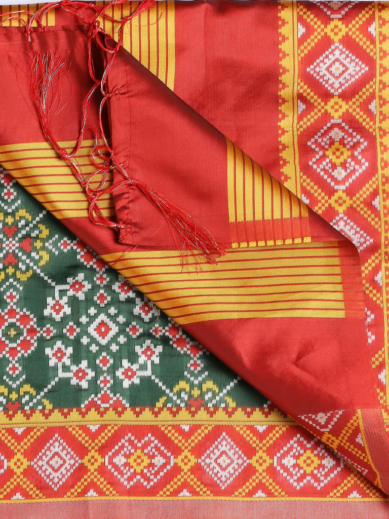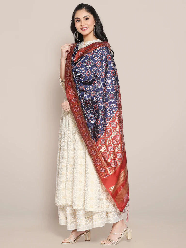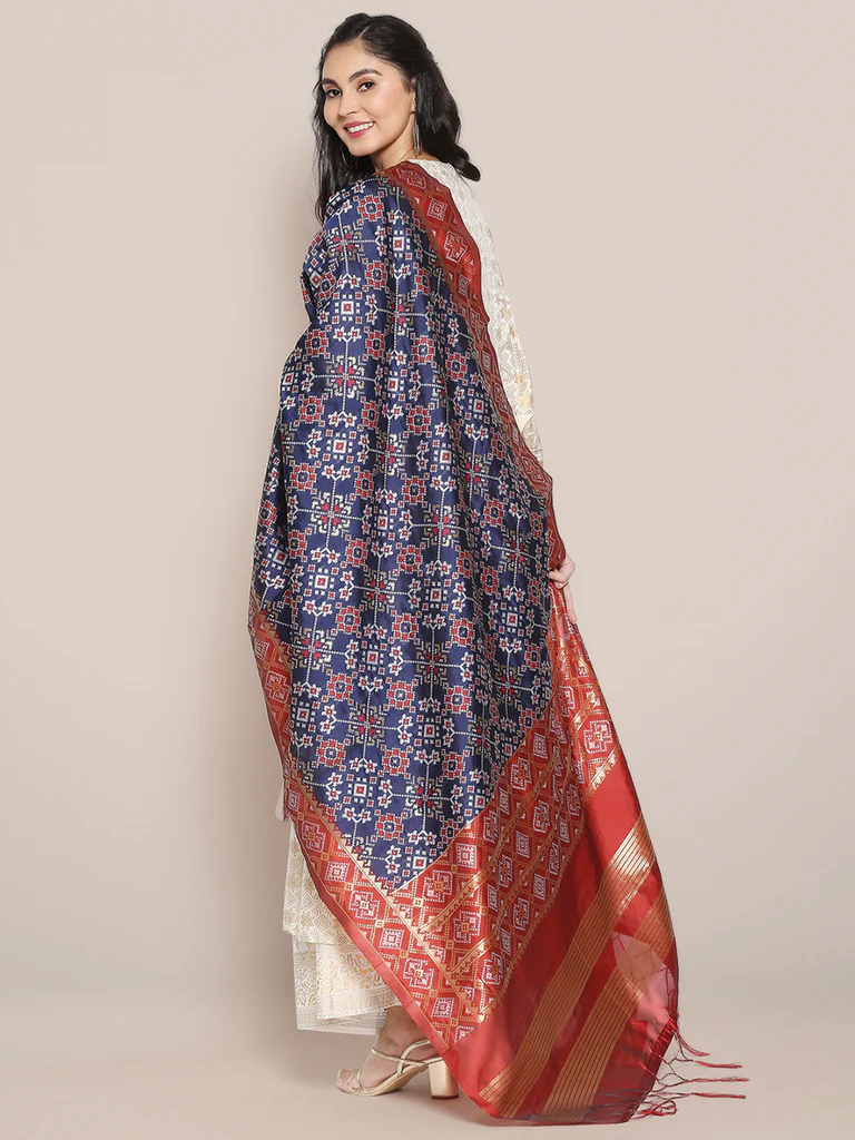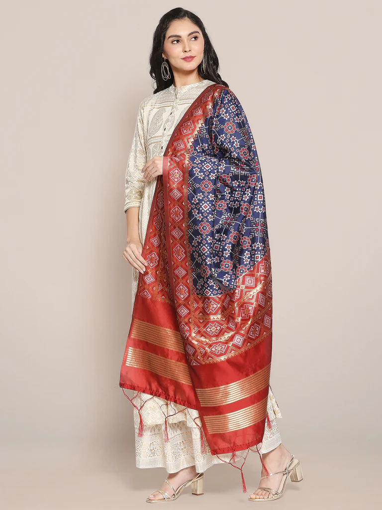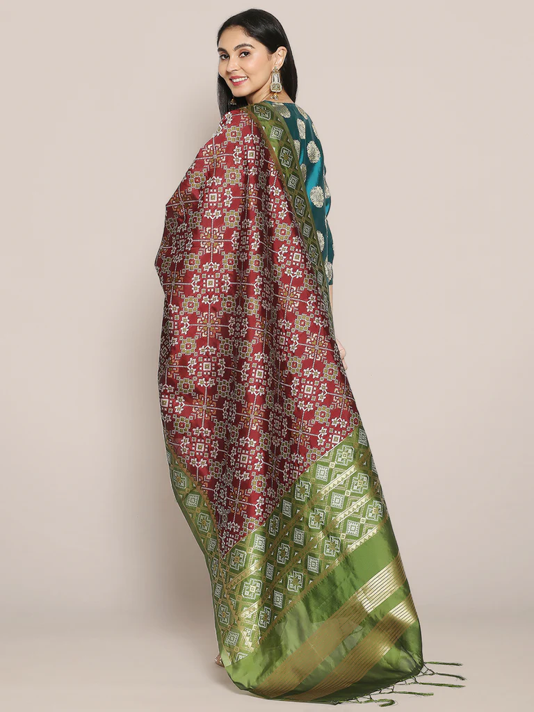 Add a touch of elegance to your wardrobe with this exquisite piece of beautiful Banarasi Silk Dupatta. Swathed with elegant Patola style weaving all over, this classic stunner is a must in your ethnic collection.