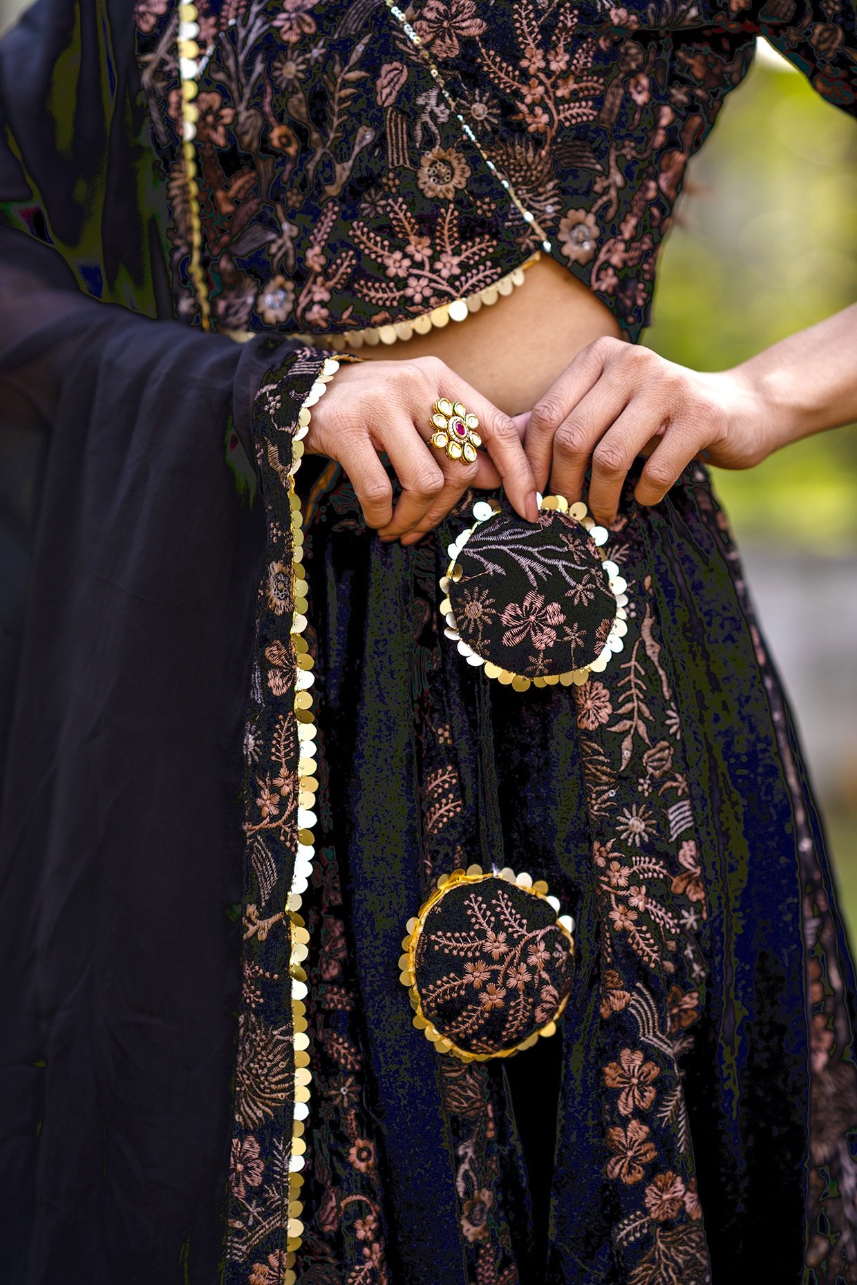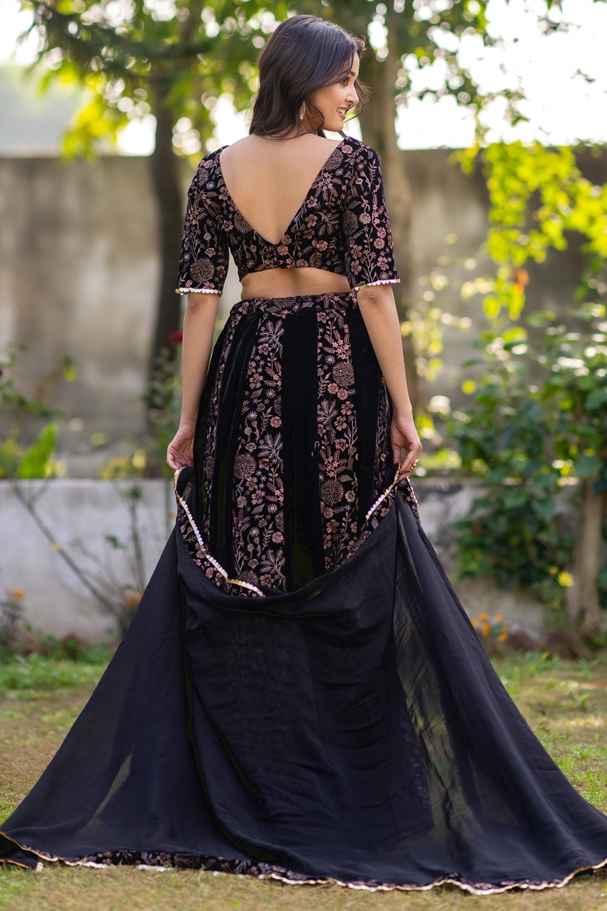 Featuring a black kalidar lehenga in a velvet base with lace and sequins embroidery. It is paired with a blouse and a dupatta. Accentuate it with statement jewellery and heels for an engagement or sangeet ceremony.