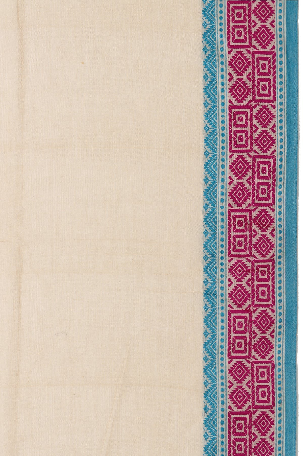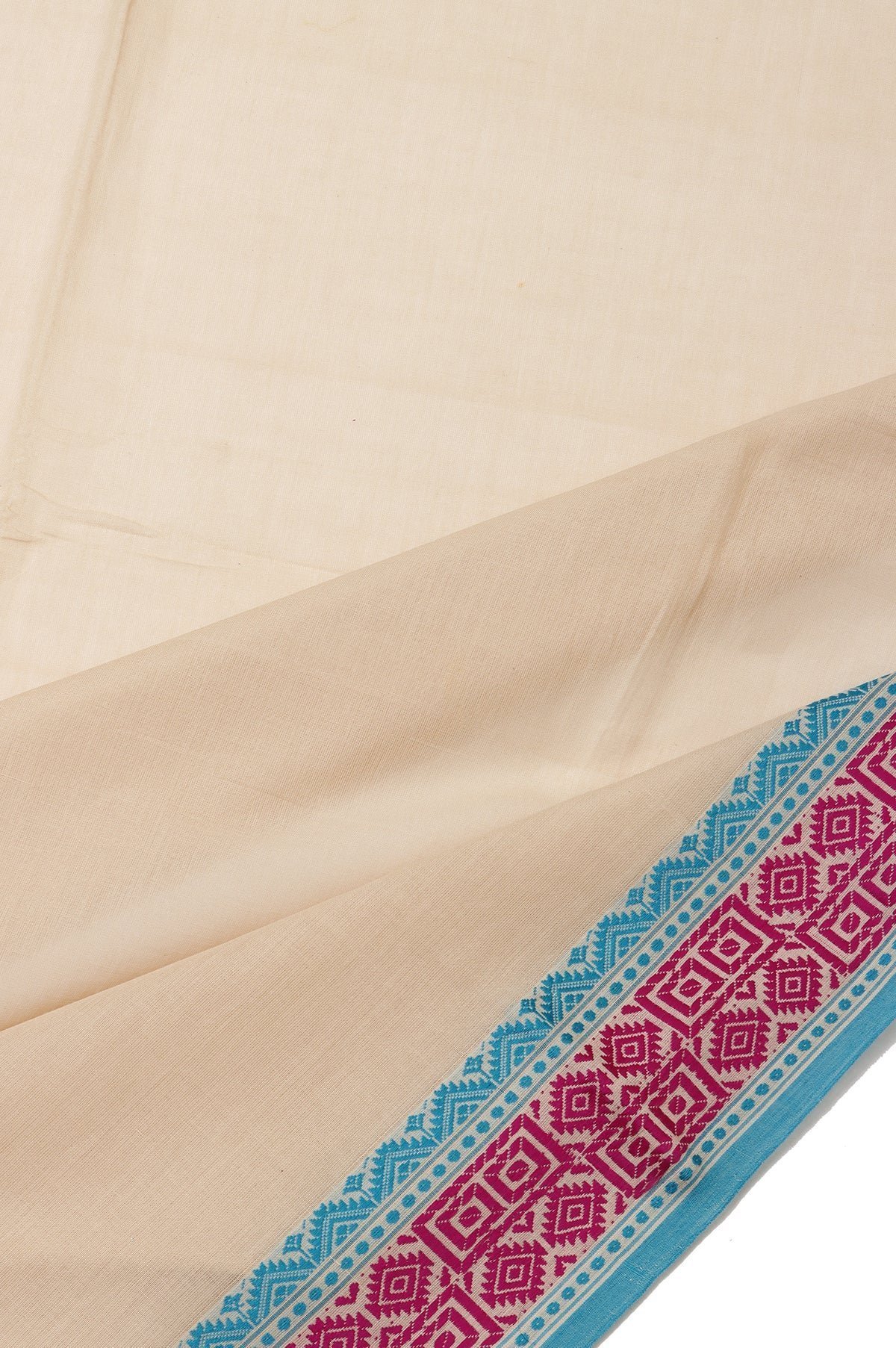 Elegant in its simplicity, this Plain Beige Bengal Cotton Saree is beautifully complemented by a serene sea blue border featuring fine threadwork and subtle geometrical designs. The self-coloured pallu is adorned with threadwork diamond buttas and matching geometrical patterns, finished with soft tassels for a graceful touch. Paired with a plain self blouse with a border, it’s ideal for understated, everyday elegance.