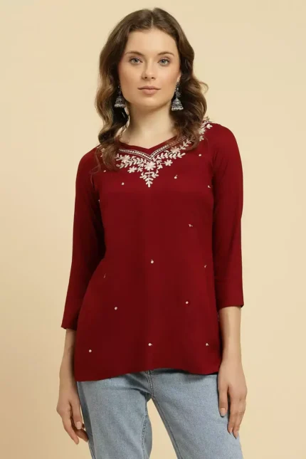 Our 1-piece red cotton straight-fit features a strappy neckline and a statement Yoke. Adorned with floral print, this style is perfect for casual wear.
