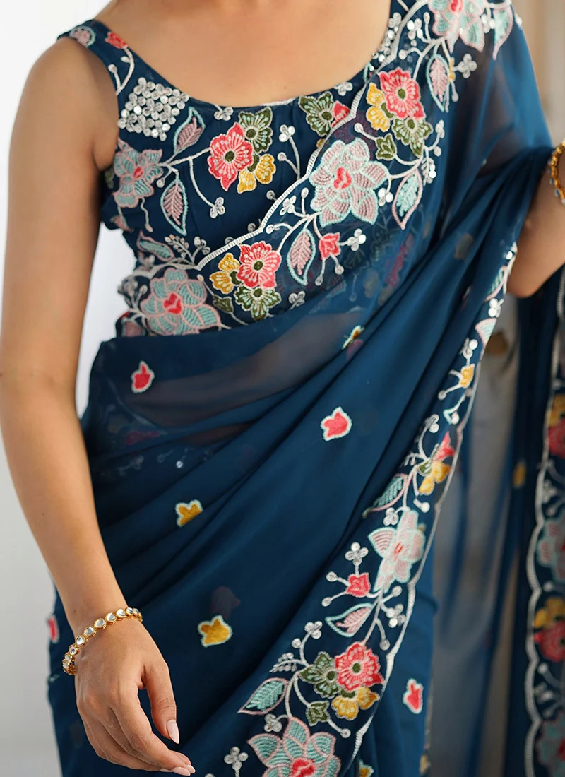 - Accompanying the saree is a Teal georgette embroidered sequins blouse which can be customized to suit your personal preferences. Whether you desire a more contemporary style with a deep Vneck or a more traditional cut with short or long sleeves the blouse can be tailored to create the perfect fit and design for your style. This level of customization allows for a truly unique and personal touch ensuring that the outfit not only looks but feels perfect when worn. The blouses sequins embroidery complements the saree maintaining a cohesive look while the customization offers versatility in terms of fit and design making the outfit adaptable for various body types and fashion preferences.